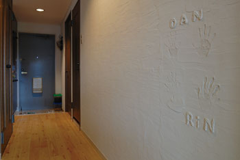 | 廊下の壁には、リフォーム記念にふたりの子どもの手形を | キッチンの床には耐久性に優れたテラコッタを使用することで、天然素材が醸し出す高級感を演出 |