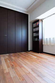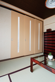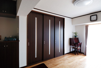 リビングの隣に広がる、バルコニーに面した和室。天井には落ち着きのある織り目調の自然クロスを、壁には和テイストの壁紙をそれぞれ採用し、畳の縁を小豆色にするなど、和モダンな趣に仕上がっている。3枚引き戸にはススキの柄が入ったアクリル板のスリットをはめ込み、明かり取りに。リビング側をダークセピア色に、和室側をニレ色に塗ることで、それぞれの空間との調和を図っている。引き戸を全開しても、リビングと和室が違和感なく溶け込んで見えるのがいい。二人の息子さんの部屋となる洋室2室には、明るい雰囲気のサクラのフローリングを採用。梁によって生じるデッドスペースは書棚として利用したり、クローゼットは天井まで延ばして奥行きも広げるなど、限られた空間を有効に活用する工夫が見られる。