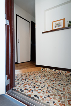 | フロアと壁に個性を吹き込んだ、戸建て感覚の玄関 |