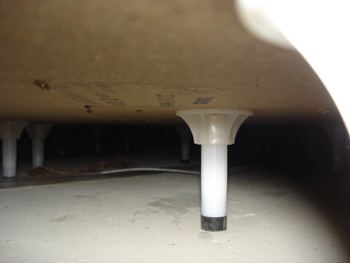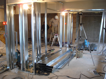 | マンションの10階ということも検討して、軽量鉄骨で下地を組んでいます。 | 床をかさ上げし、バリアフリーに。防音材で階下への音も安心です。 |