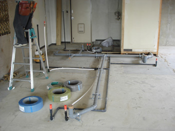 | 向かって右がトイレ。左が洗面所とお風呂。手前がキッチン用の新しい排水・給水管です。 | 対面キッチンをつけるための間仕切り壁です。 |