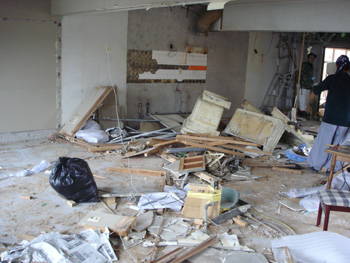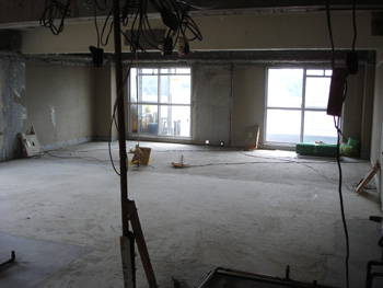 | 何もかも解体しました。お施主様は隣の部屋へ一時引っ越しされています。 | すっかりスケルトン状態に。 |