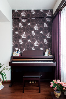 | 一面だけを花柄のクロスにして、空間に表情をつけた寝室。収納スペースもすべてつくり直し、使い勝手も向上した | キッチン側から見たダイニング&リビング。床の色や建具、従来からの家具など、統一感のある仕上がりになってる |