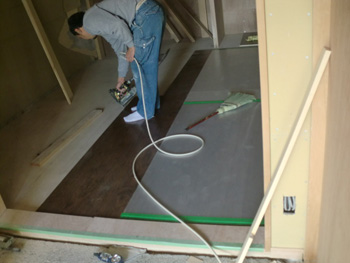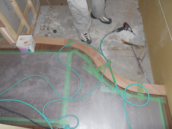 | フローリングをていねいに張り付けていきます。幅が広いフローリングで高級感を感じさせます。 | 誰もが通る玄関にはこだわりのR框を造作。土間部分が広がる効果もありゆったり感も出ました。 |