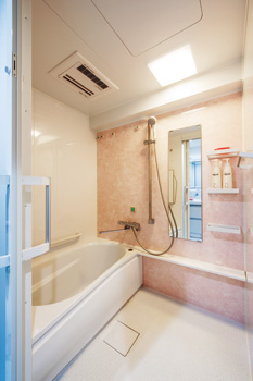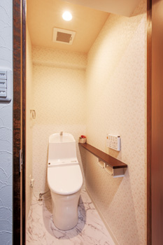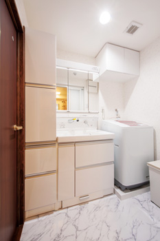 | 洗面所の床は玄関と同じフロアタイル。収納スペースも拡大した | 気分が悪くなったときに備え、インターホン連動のブザーを設置 |