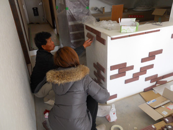 | リビングに面した壁にはタイルをランダムに貼りデザイン性を持たせる狙い。コーディネーターと職人が必死にバランスを考え施工中。 |