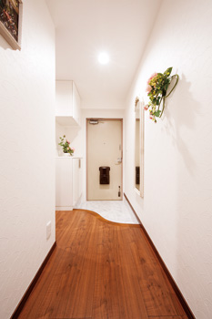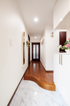 | アールのついた特注品の上がり框で玄関を拡張。 下駄箱も壁の色に合わせた白に変更し、全体的に明るく視覚的な広がりも感じさせる。 土間は大理石風のフロアタイル |