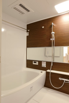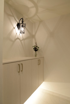 広さはそのままでTOTOのシステムバス、サザナの1418サイズに一新。愛犬の散歩から帰って来て玄関から直行できるようになったのもポイント 壁の照明と収納下の間接照明でオシャレな印象の玄関。外光を取り入れることが難しいため、白で統一して明るい空間に。夏にひんやりする大理石調のタイルは愛犬もうれしいはず