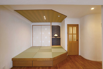 子育てを終え、愛犬を傍らにゆったり暮らす熟年夫婦の住まいを想定してマエダハウジングがリノベーションした築20年のマンション。まず、間取り変更においては6畳の和室をLDKに取り込み、小上がりを設けて4.5畳の畳スペースを確保した。