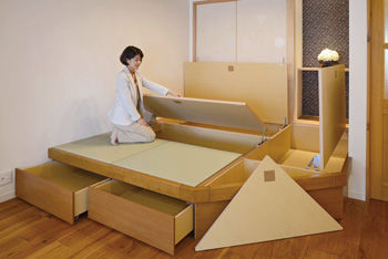 イギリスのブランド「オズボーンアンドリトル」の壁紙で仕上げた戸襖は、畳スペースにほんのり洋風テイストを醸し出す 畳を持ち上げるとそこには大容量の収納スペースが。三角のコーナーまでしっかり活用できるよう工夫されている。小上がりの横には大きい引き出しが付いていて、ここからも物を出し入れできて便利