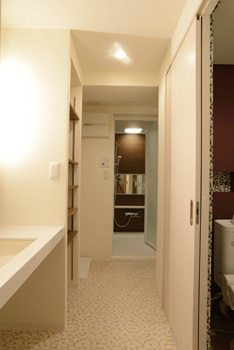 壁にはモザイクタイル、床にはモザイク柄のクッションフロアを配した洗面脱衣室。可動棚も造り付けているため、タオルや着替えなどを収めるにも便利 トイレと洗面脱衣室から浴室へは一直線。トイレの周囲を一周できる回遊性をもたせている