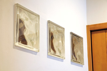 LDKとトイレを隔てる壁にはガラスブロックを埋め込み、漆喰壁にアクセントを加えるとともに採光にも貢献。トイレが使用中かどうかも分かりやすい 上部に間接照明を施したムーディーなリビングを正面に見ながら家事ができるキッチン。昼はベランダからも明るさが取り込める