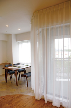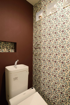 レースカーテンはもともとあったカーテンボックスを取り払い、天井から吊すことでより広さを感じられるよう工夫。優雅なダイニング空間が広がる ガラスブロックやニッチを設けたトイレのクロスは2種類を貼り、1つは大胆な柄入りを選んでイングリッシュテイストの部屋のような雰囲気に