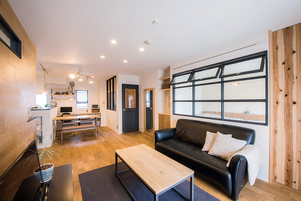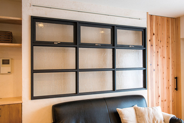 壁面にガラスを多用することで開放感を増し、全体をカフェのようなおしゃれな空間にコーディネートした。「オリジナリティーを大切にしたかった」と、できるだけ既製品は使わず、ドアや窓、キッチン収納などあらゆる建具を造作で調達したことも、スタイリッシュ感あふれる空間づくりに貢献。また、自然素材も積極的に採用し、床は自然塗装したナラの無垢材、壁はご夫婦が親族や友人らと力を合わせて漆喰塗りにした。