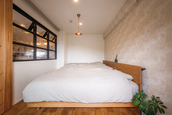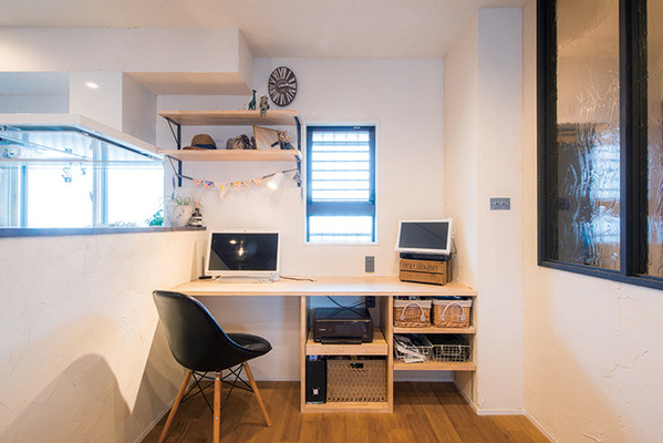 | ご主人が仕事で使うPCコーナーのカウンターや棚も造作。使う度にプリンターを取り出していたわずらわしさが解消できた | 寝室の室内窓の上にはロールスクリーンを設け、リビングから漏れる光を遮断できるようにした。そのため夜遅くまでご主人がリビングにいても寝室を暗い状態にでき、奥様とお子さんの安眠を妨げないようにすることができる |