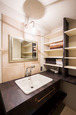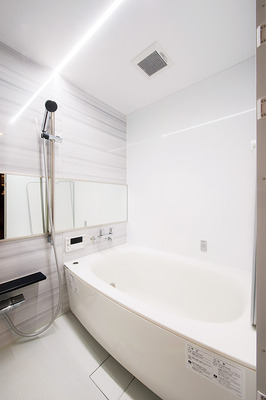| 居室とは一変してクールな印象にまとめた洗面室。広さを増した分、造作棚を設けて収納力を向上 | お好みで色調が変えられるライン照明をご主人が気に入って採用したパナソニックのシステムバス |