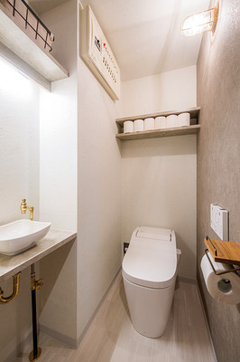 | タンクレスタイプを選んだトイレ。壁にはアクセントクロスを張り、照明はマリンランプを採用 | 手持ちのタンスも収まる大容量のクロゼットを壁面に確保した、収納目的の洋室。リビング同様、床はスリッパ要らずの心地良さ |