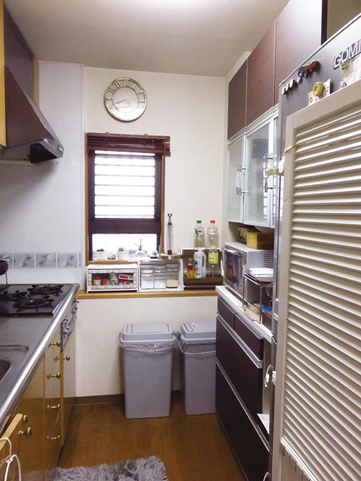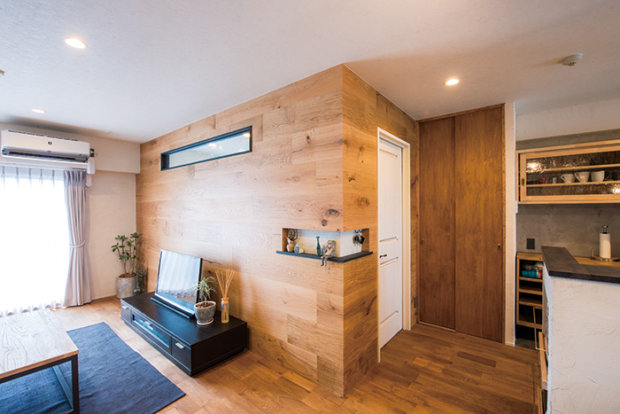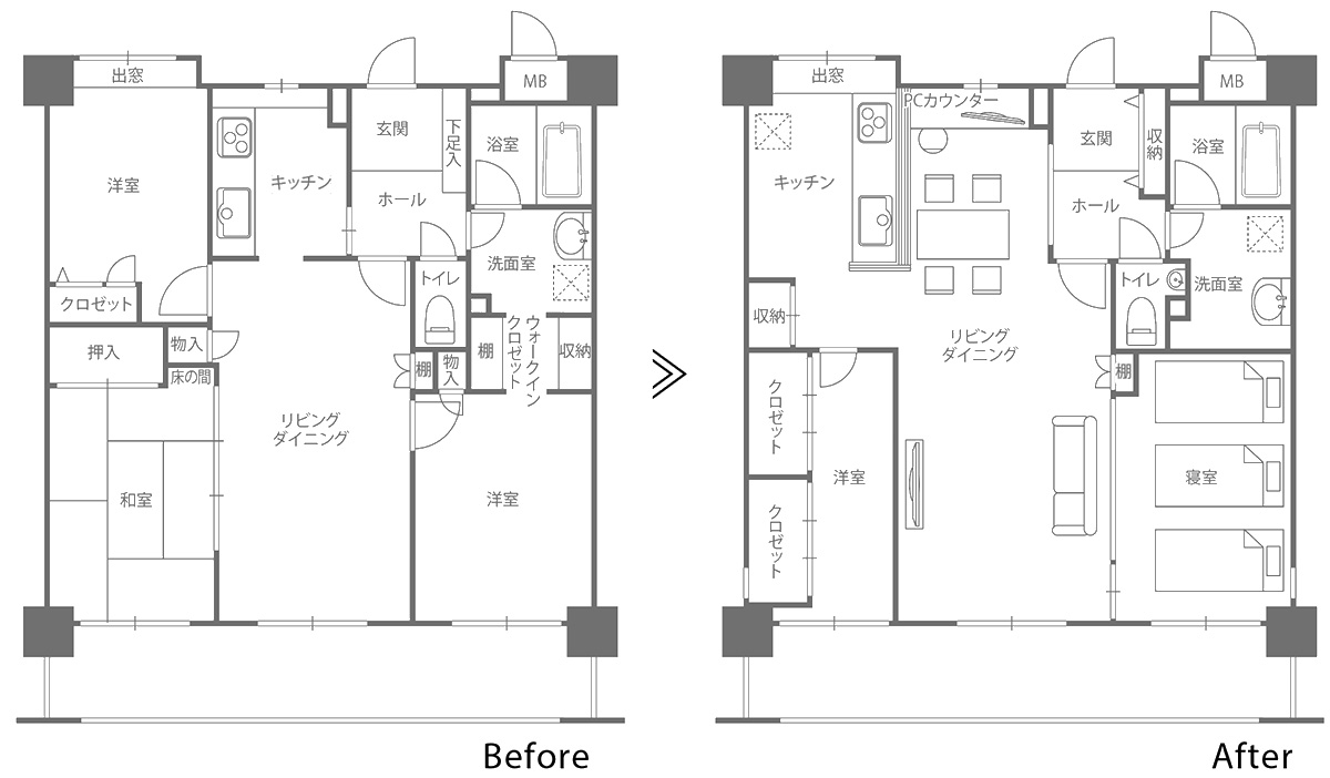 物置だった洋室と独立型のキッチンをリビングダイニングに取り込んでLDKにし、ダイニング横にPCカウンターを設置。廊下に面したキッチンの出窓は防音対策のため二重サッシを取り付けた。和室は収納目的の洋室に変更し、リビング横の洋室は収納スペースを取り込んで広さを増した寝室に。水回り設備は全て一新。床や壁は自然素材の採用で快適性を高めた。
