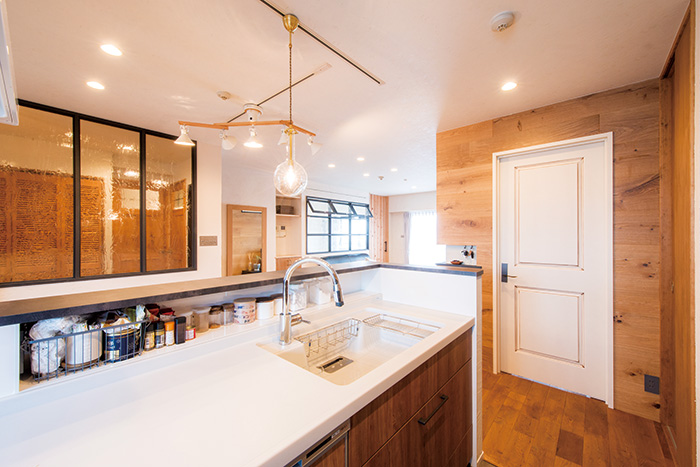 | リビングの一角を洋室とし、奥様のアイデアでモンスターオークという幅広の床材を壁全面に採用。コーナーに設けたニッチにはアイアンで作ったキーフックが | システムキッチンは汚れが目立たず掃除しやすいパナソニック製。「常に家族が顔を合わせていられるのがうれしい」と奥様 |