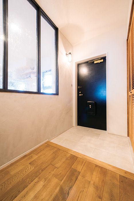 | 室内窓を大きく開口したことで明るさと開放感が増した玄関。窓ガラスが泡入りのため、リビング内が丸見えにはならないのが特長 |