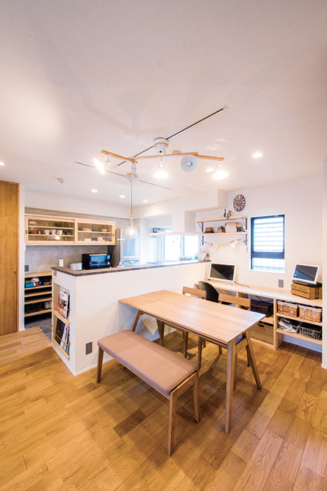 独立型で閉鎖的だったキッチンと隣の洋室をリビングダイニングに取り込んで誕生したLDKは、"カフェ気分になれる家"をイメージしたご夫婦の理想的空間。ダイニングでくつろぐ家族や友人と会話しながら料理ができ、以前より配膳がスムーズになったことに奥様は喜んでいる様子。ご主人は念願だったPCカウンターと照明へのこだわりを実現。照明のスイッチはつまみを上下させるトグルスイッチで統一し、水回り以外は全て暖色系の照明を選択した。「帰宅後、キッチンのペンダントライト1つだけを点けて落ち着ける雰囲気にするのが好きですね」と満足そうなご主人。
