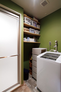 | ご主人がたくさん持っている帽子は、天井近くのスペースを活用して掛けられるよう工夫している | モスグリーンのアクセントクロスが印象的な脱衣室。上部のデッドスペースを可動棚で活用 |