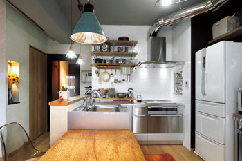 結露やカビを防ぐため、LDKをはじめほとんどの空間の壁を珪藻土塗りに。O様ご夫婦が週末を利用し、一部スタッフの手も借りながら約3週間かけて手塗りしたという。和室との間仕切りを取り払って広くしたLDKは、夫婦くつろぎの空間。「部屋干ししても湿気を感じず、においも残りません。珪藻土壁パワーを感じています」と、結露やカビの悩みからはすっかり解放された様子。ご主人が足場板で製作した棚やテーブル、店舗のようなダクトと天井にはわせた電気の配管、調理器具をアイアンレールにフックでつるす収納など、LDKはカフェのようにスタイリッシュ。鉄工所での加工部分とご主人の自作部分を職人が着実に組み合わせて設置したキッチン棚に象徴されるように、ご主人と職人、マエダハウジングが三位一体となり、コミュニケーションを取りながら進めたことが功を奏した。