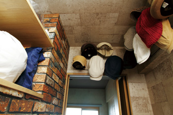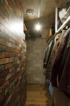 | 足場板で作った枠に鏡をはめ込んだ大きな姿見。玄関の壁面に取り付け、全身チェックできる | レンガ柄のクロス2種類を貼り分けたウォークインクロゼット。天井には脱臭機器も設置 |