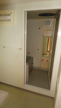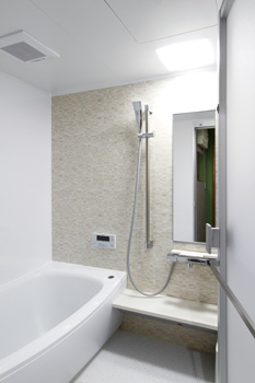 | 奥の壁に貼ったアクセントクロスは、コーディネーターが選んで提案したもの | TOTOのシステムバスに一新した浴室。前よりも少し広くなり、ゆったり入浴できる |