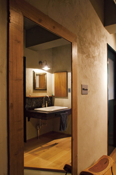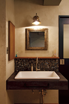 | 廊下に新設した洗面台。重厚感ある鏡は息子さんが暮らす熊本の雑貨店で奥様が見つけて購入 | 洗面台の壁にはアクセントとしてモザイクタイルを採用。アーチを描く蛇口はコーディネーターから提案 |