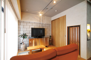 | テレビ台には奥様の発想で厨房機器を代用。奥の壁にはコンクリートブロック風のタイルを貼った。右手には仏間も配置 |