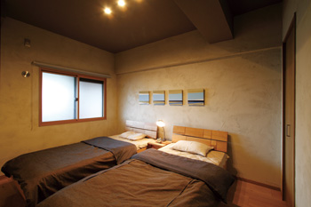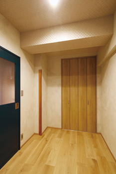 | 以前は和室で寝ていたが、布団の上げ下ろしをしなくても済むよう洋室1室を寝室に。結露防止のため二重窓を採用した。無垢材の床と珪藻土壁による清浄な空気に満たされた中で快眠できる | もともと子ども部屋だった洋室は、廊下を広くするために狭くした。ドアはアイアン塗装でスタイリッシュに |