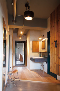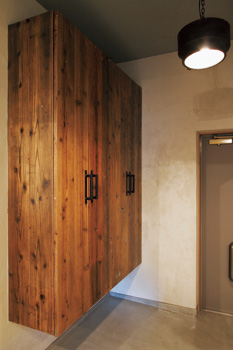 | 造作の玄関収納。アイアンの取っ手もご主人が製作したもの | 以前に比べて約2倍の幅に広がった廊下と玄関。廊下の床と玄関土間はあえて斜めに切り替え、玄関収納を浮かせて造作することで、限られた空間を広く感じさせることができる |