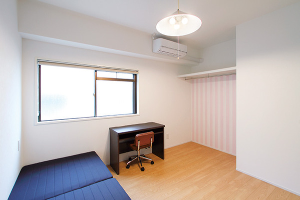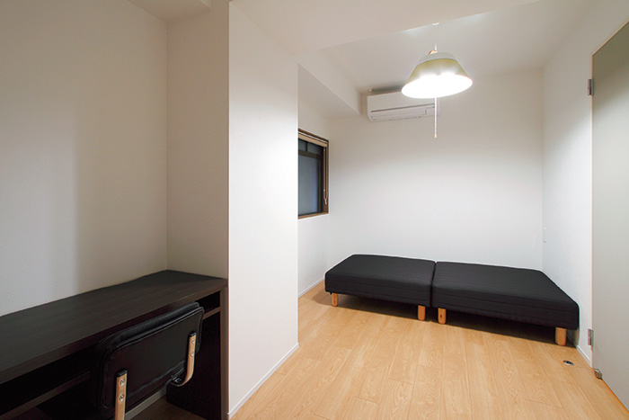 | 6つの賃貸物件(2DK)で構成されていた3・4階のフロアを、9つのワンルーム(3階3部屋+4階6部屋)に変更。 | 広さは平均6帖だが、全ての部屋に収納を設け、ベッドとデスク、照明とエアコンを備え付けている |