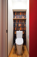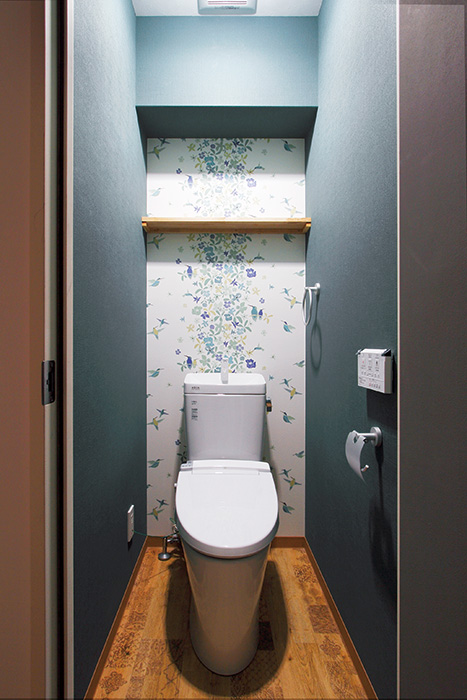 | グレー扉のトイレ内部。ドアと同じグレーのクロスと小鳥模様のクロスを採用 | 赤い扉のトイレ内部。こちらはホワイトのクロスと本棚模様のクロスを採用 |