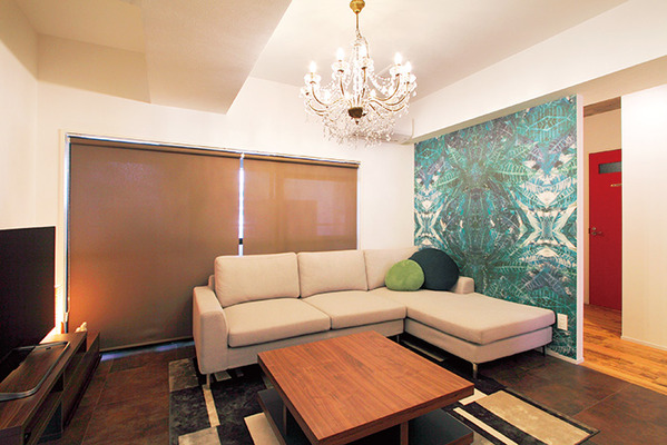 | ソファでくつろいだりテレビを見たり、入居者が自由に利用できるリビング。フランス・テシード社の壁紙ブランド「カサマンス」のクロスを壁の1面に採用。アンティーク感漂うシャンデリアとうまく調和している |