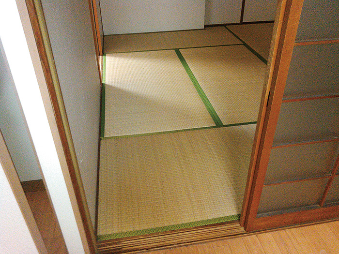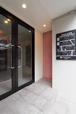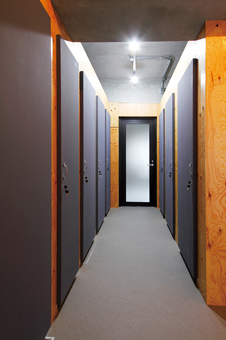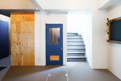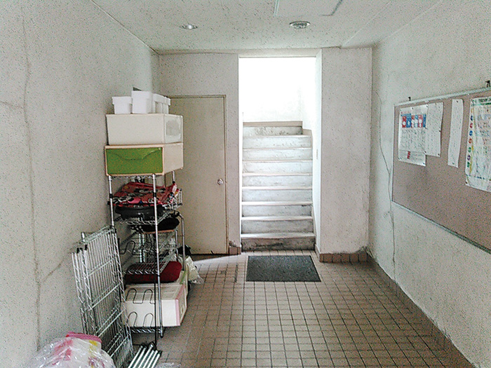 | シェアハウス入居者分のトランクルームを1階共用部に新設。収納スペースの悩みを解決してくれる | 2階に続く階段やポンプ室のドアも、リペイントで一新。以前とは印象が大きく異なるアプローチが誕生 |