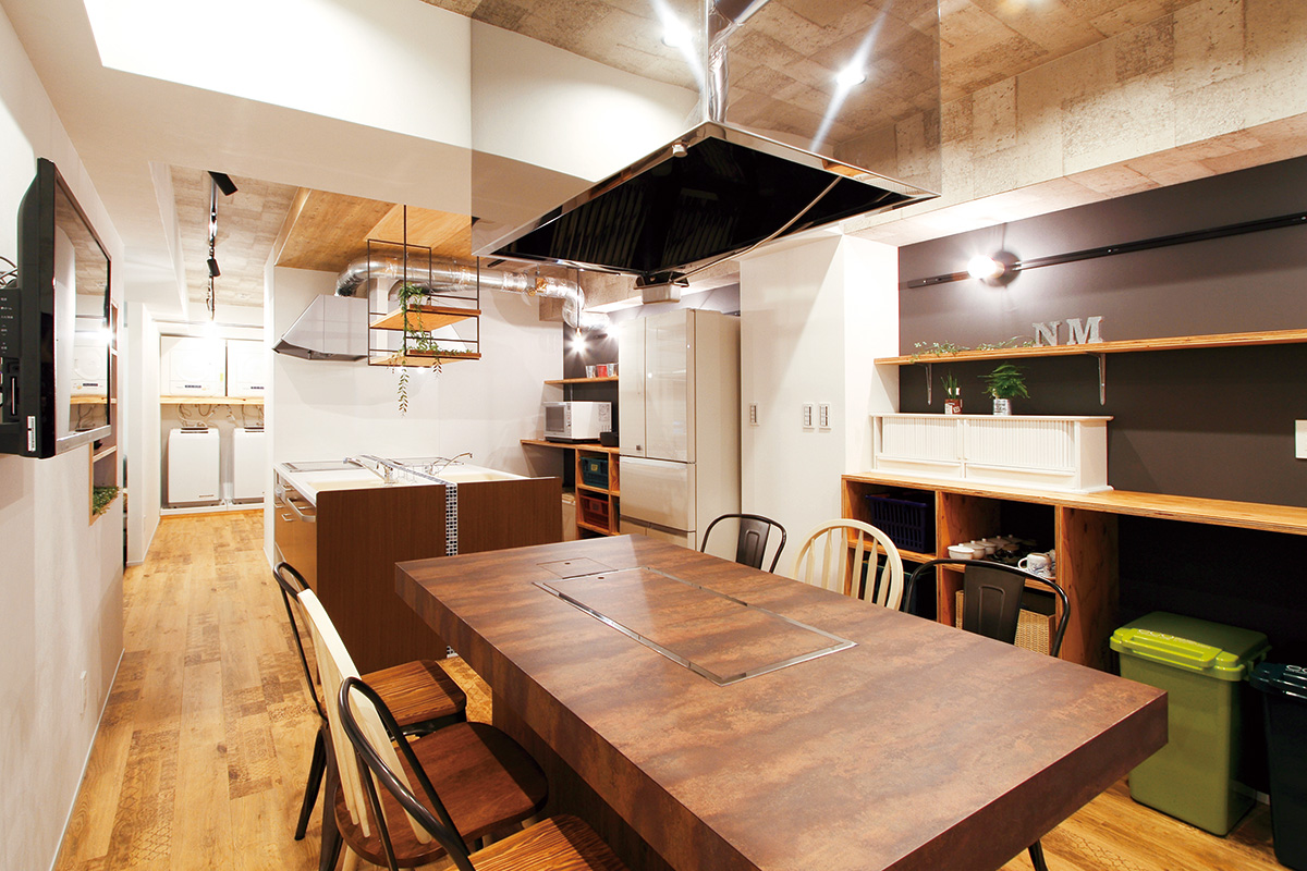 リノベ計画のテーマにしたのが、広島出身者はもちろん、県外から来た人みんなが好きになれる空間づくり。その象徴として、共用のダイニングにお好み焼がつくれる鉄板テーブルを取り入れた。その他、入居者が自由にくつろげる明るいリビングや、使い勝手がよいように複数設けた洗面台・トイレなど、細部にまでO様のプランニングを反映した。