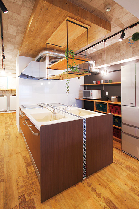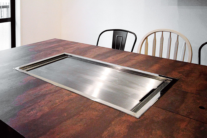 ダイニングテーブルには、お好み焼をつくれる鉄板を内蔵。調理中の煙・におい対策に、ハイパワーな換気扇も取り付けている。入居者同士で鉄板を囲み、楽しく過ごす機会も増えそう。鉄板を使わないときは専用のふたをして、フラットな状態で利用できる。 |