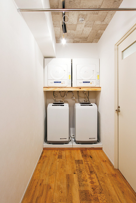 | 混雑しないように洗濯機と乾燥機は2台設置。洗濯物干しに便利なポールも完備している | 丸いミラーとスクエアの洗面ボウルを組み合わせた洗面室。柿渋色のクロスが印象的 |