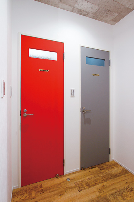| 4階の浴室の隣に配置した2つのトイレ。赤とグレーのカラフルな扉が、生活空間を楽しく演出 | 扉や壁を新築同様にペイントしたエントランス。フロアガイドのパネルや郵便受けも新しく作り付けた |
