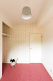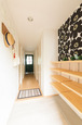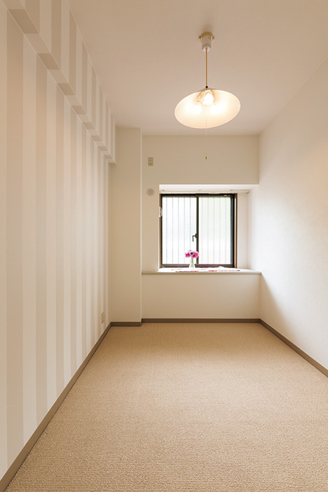 | ベージュとオフホワイトのストライプが印象的な洋室。床はクロスに合わせてベージュのじゅうたんをセレクト | マリメッコのクロスをアクセントにした玄関。シューズクロゼットは圧迫感のある扉を設けず、可動棚を造作してオープンな造りに |