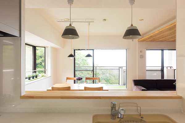 | 和室をリビングに変更した開放的なLDK。構造上、和室とダイニングの境目にあった段差は、間接照明を設置して柔らかな雰囲気を演出。個性豊かなデザインクロスが引き立つように、全体は白を基調としたシンプルな空間に仕上げた | つり戸を撤去したことで、視界が広がったキッチン。高台に建つマンションならではの景観が広がる。照明は全てmame decoでセレクトしたもの |