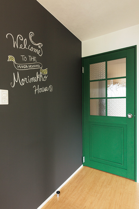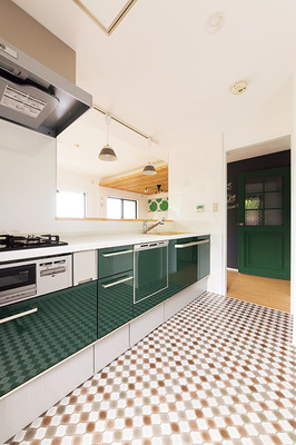 | リビングドアは、森をイメージしてグリーンを塗装。チェッカーガラスや泡ガラスなど異なるガラスを組み合わせたmame decoオリジナル | 目線が抜ける開放的なキッチン。キッチンや造作のリビング扉は、テーマカラーのグリーンで統一。コラベルタイル柄のクッションフロアがアクセント |