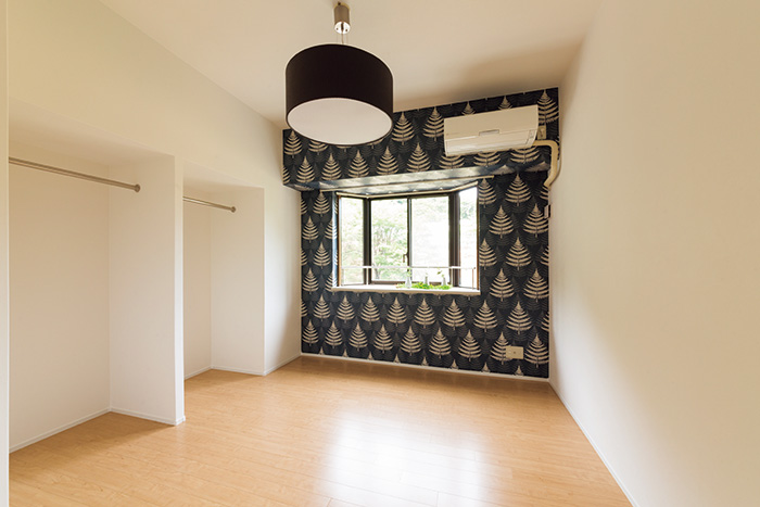 | ネイビーの北欧風クロスとペンダントライトで落ち着いた雰囲気を演出。クロゼットの扉はあえて撤去し、空間に視覚的な広がりを持たせた | サーモンピンクのじゅうたんとウサギ柄のクロスが愛らしい洋室。部屋ごとにテイストを変えて空間づくりを楽しんだ |
