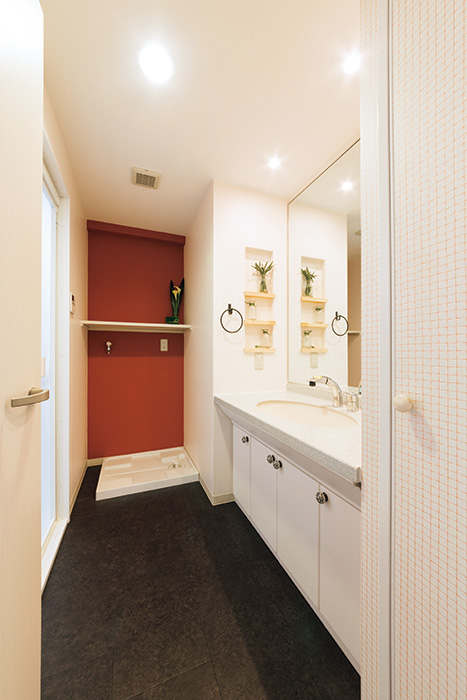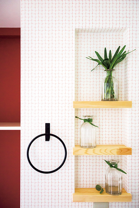| 洗面室は大理石調のクッションフロアとえんじのクロスでシックな雰囲気に。洗面台は既存のものを生かしてコストダウン | 味気ないプラスチック製の収納棚は愛らしいニッチに変更。アイアン製のタオル掛けがアクセント |
