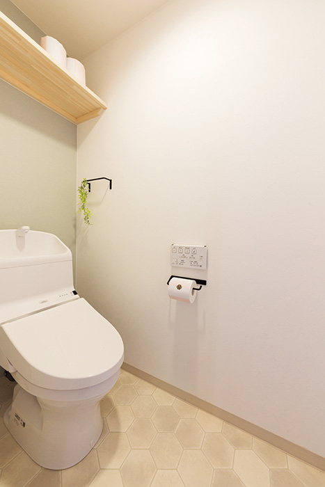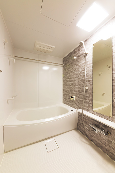 | トイレは清潔感のあるブルーグレーのクロスとハニカム模様のクッションフロアをセレクト | 老朽化していたバスルームも設備機器を一新。ゆったりくつろぎのバスタイムを演出 |