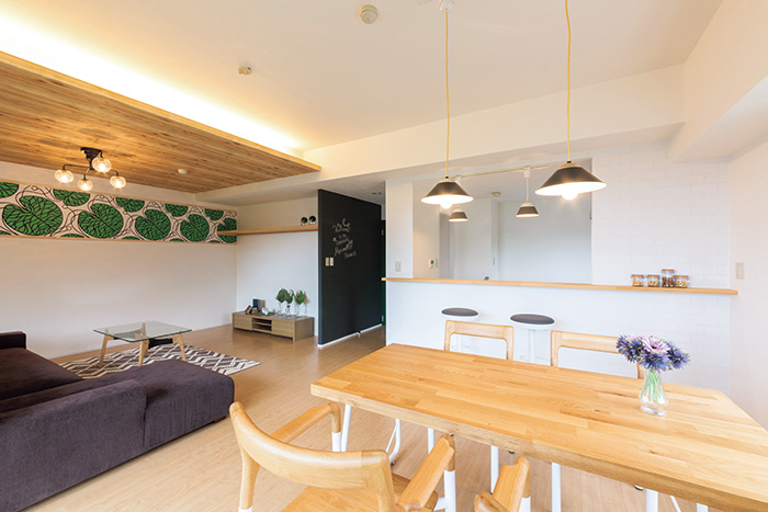 緑豊かな高台から太田川を望む築20年のマンションをリノベーション。眺望の良い南側に面していた和室をLDKに取り込み、4LDKを空間にゆとりを持たせた3LDKに変更した。閉鎖的だったキッチンのつり戸を撤去したことで、窓からの眺望までも暮らしに取り入れた開放的なLDKを実現。構造上、高さの異なる和室とダイニングは、空間に一体感を持たせるために、段差を生かした間接照明を設けた。ライン状にあしらったマリメッコのクロスや天井のウッド調クロス、一部に黒板クロスなどをあしらい、遊び心いっぱいの空間が完成。また、玄関や洋室の収納にはあえて扉を設けず、オープンにして視覚的な広がりを演出した。暗かった玄関には、洋室からの光を取り込むガラスブロックを配して光を確保。デザイン性はもちろん、暮らし心地にもこだわった小さな工夫が随所にちりばめられている。