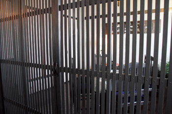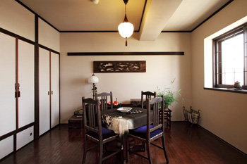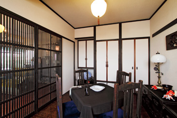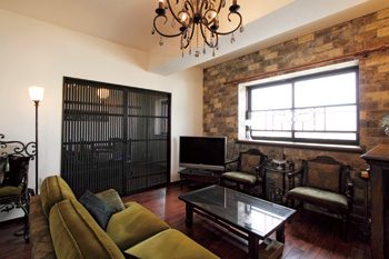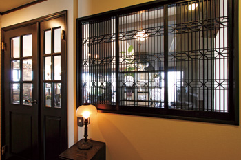 | LDKに隣接している洋室は、もともと和室だった。重厚感のある床材と、温かみのある塗り壁が、アンティーク家具をさらに魅力的に演出する。照明もアンティークで揃え、愛好家の心がたっぷりと満たされる空間となった | 格子戸は、空間を仕切りつつも光や風を通す圧迫感のなさが特徴。また、職人による手仕事のため高級感も醸し出す |
