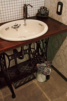 | 奥様が選んだ格子戸をカットしてはめ込み、リビングと洋室の間仕切りに利用。夫婦が同じリビングで過ごしていても、程よいプライベート感を保てる | ミシン台を造作したかわいらしい洗面台。シンクや水道のハンドルはレトロなデザインを選択 |